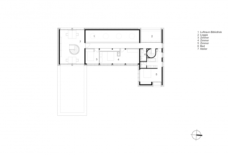 Wohn- und Arbeitsnutzung werden wie zwei ineinander verschränkte L-Figuren organisiert. Den Mittelpunkt des Hauses bildet die über zwei Ebenen eingeschnittene Bibliothek. Sie liegt an der Schnittstelle der beiden Nutzungen und kann über raumhohe Türelemente zu jeder der beiden Einheiten zugeschaltet bzw. abgekoppelt werden. Im Erdgeschoss steckt sich der langgestreckte Raum durch das gesamte Gebäude hindurch und lässt an seinen Enden kleine gefasste Kabinette mit Passepartout-artigen Ausblicken ins Freie entstehen. Hier werden die Garderobe des Wohnbereichs und die Atelierküche untergebracht.