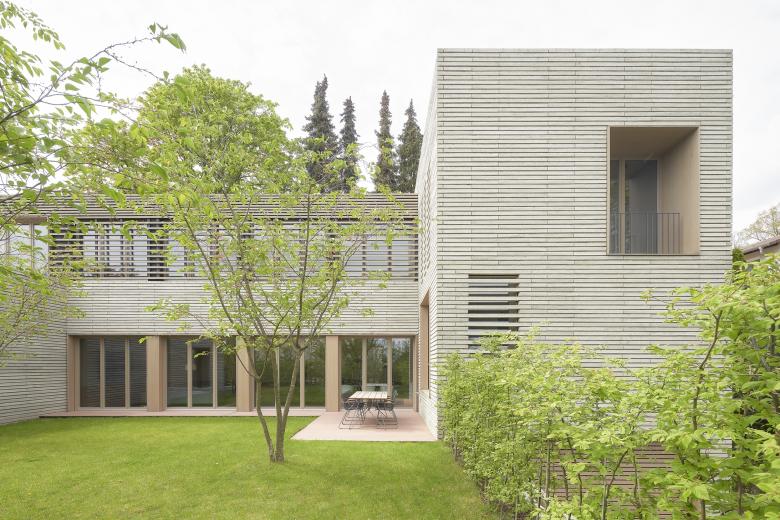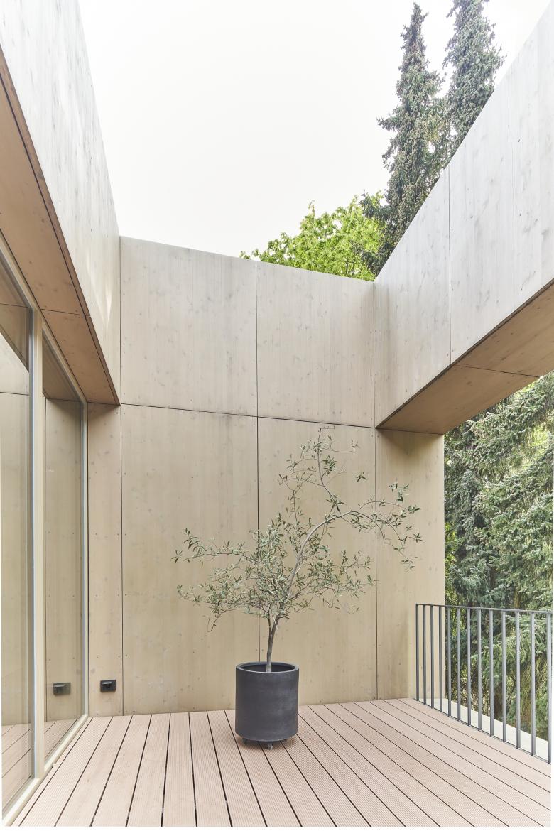 Im Inneren des Hauses harmonieren puristische Sichtbeton- und Holzoberflächen und lassen ruhige, teils offene, teils introvertierte Raumzusammenhänge entstehen, die auf die jeweiligen Nutzungsbedürfnisse reagieren.
