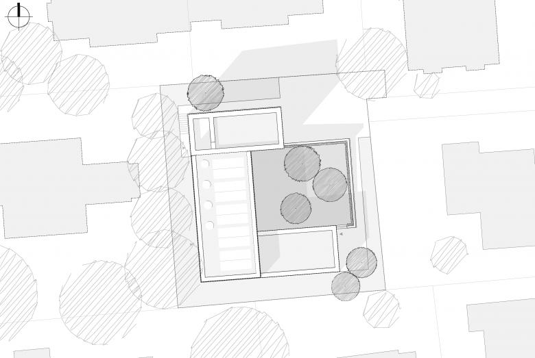 Das Baugrundstück befindet sich in einem Wohngebiet am nordwestlichen Rand des Flüsseviertels im Kasseler Stadtteil Bad Wilhelmshöhe. Der 1-2 geschossige Baukörper fügt sich ruhig und harmonisch in die ansteigende Topografie ein. Zur Zufahrtsseite erhält der Neubau einem markanten zweigeschossigen Hochpunkt, aus dem heraus sich ein U-förmiger Sockel entwickelt, der sich um das höher gelegene Gartenplateau legt und dieses maßvoll einbeschreibt. Während sich der monolithische Baukörper aufgrund seiner Nähe zu den umliegenden Nachbargebäuden nach außen als gefasster, eher verschlossener Block artikuliert, öffnet er sich mit großen transparenten Öffnungen zum Innenhof.