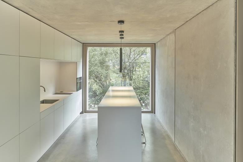 Die aus lediglich zwei schlichten Blöcken bestehende offene Küche schließt sich fließend an den Wohn- und Essbereich an und orientiert sich ebenfalls zum Gartenhof.