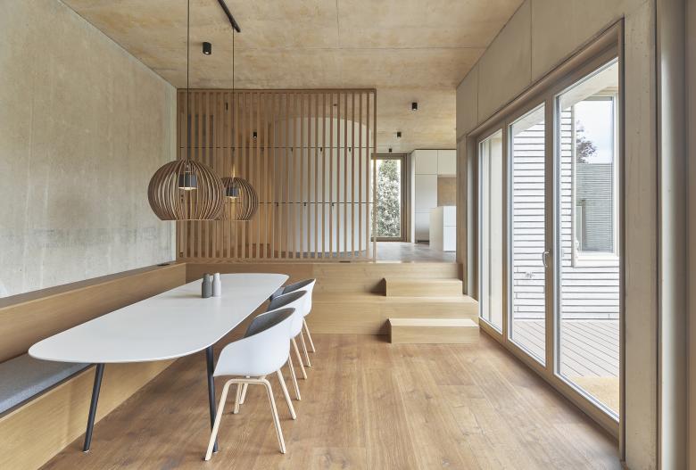 Eine, den Raum dreiseitig umschließende, Sitzbank aus Holz modelliert den Höhenversatz, beschreibt den Essplatz, die Sofa-Lounge und einen freihängenden Kamin in ihren Verlauf ein und orientiert sich ebenso zum Freiraum.