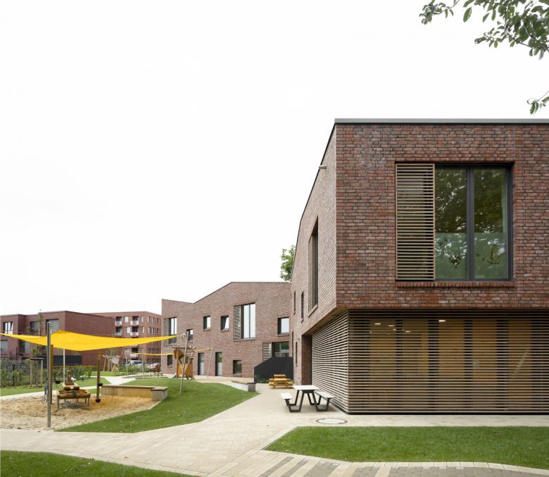 Im engen Zusammenspiel mit den gegenüberliegenden Wohngebäuden bildet der Neubau der Kita den markanten Auftakt zum neuen Wohnquartier Buchholzer Grün in Hannover.