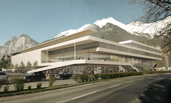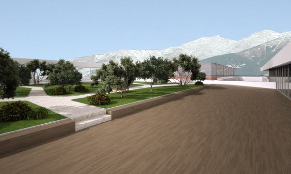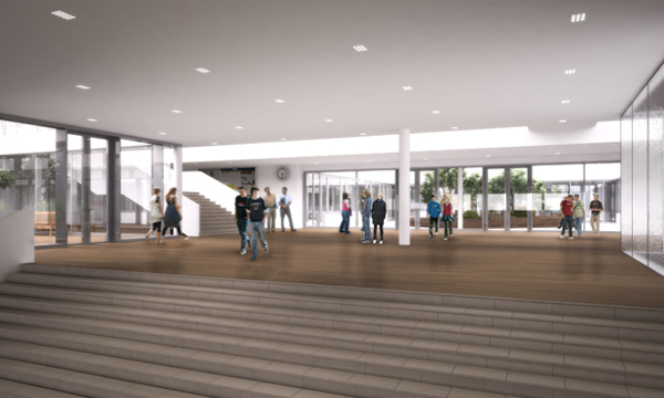 Die Benutzer der Schule sind im öffentlichen Raum sichtbar. Ihr Weg führt aber doch rasch weg vom Straßengeschehen, hebt sich klar vom Einkaufszentrum ab auf den 5 m höheren, morgenbeschienenen Vorplatz. Foyer, Garderobe und großzügige Freitreppe zelebrieren die Frei- und Pausenflächen und bieten eine spannendes Raumerlebnis.