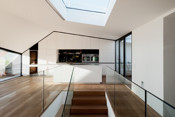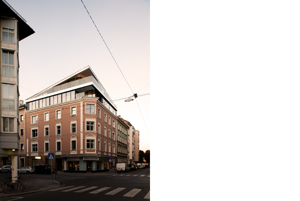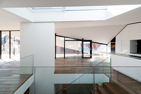 Die beiden ineinander verschnittenen Satteldächer sorgen für ein lichtdurchflutetes Wohnambiente über zwei Etagen. Die dadurch entstehenden Dachschrägen betonen bewusst die Ecken und Kanten des Wohnungsumrisses und führen die Dachlandschaft der angrenzenden Blockrandbebauung fort.