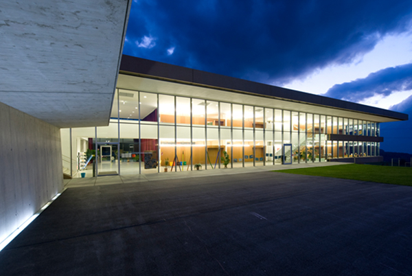 Der riegelförmige Baukörper begrenzt durch seine Ausrichtung das Areal von Kindergarten, Sporthalle, Gemeindesaal und Feuerwehr und bildet einen neuen Platz, der als Schulhof den Blick über das Inntal in Richtung Nordkette einrahmt. Die allgemeinen Erschließungs- und Pausenflächen sind zum Schulhof orientiert, die Klassenräume blicken in die Natur, die zweigeschossige durchgesteckte Aula verbindet das künstliche mit dem gewachsenen Umfeld.