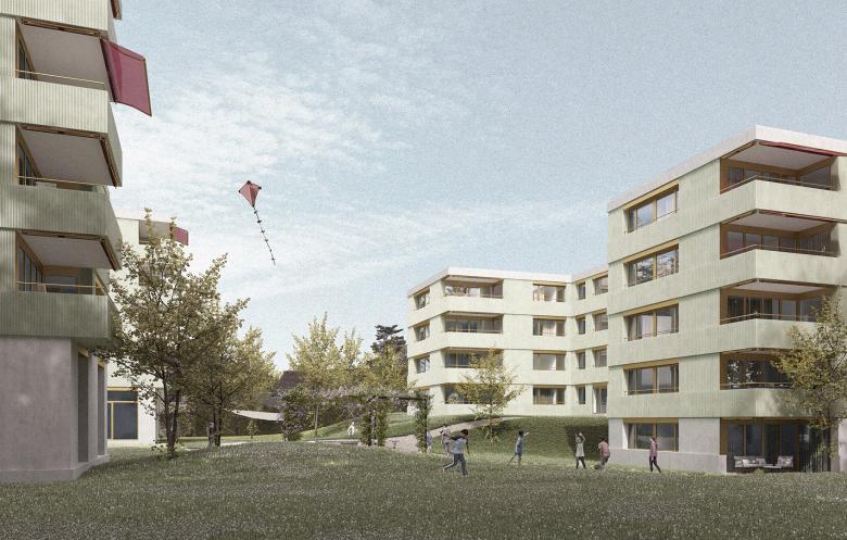 Die städtebauliche Setzung der beiden neuen Wohnbauten der Siedlung 17 mit 45 Wohnungen und einem Kolonielokal spannt einen Innenhof als Aufenthalts- und Begegnungsraum auf, der zur Aneignung durch die zukünftigen Bewohner und zur Identität der Siedlung beitragen soll. Die Hueb- und die Zürcherstrasse sind durch den Hof miteinander verbunden, die Mitte dieser Verbindung weitet sich platzartig auf und lädt mit einer von Glyzinien berankten Pergola, sowie einem Brunnen zum Bespielen ein. An der seitlich angrenzenden Böschung bietet ein Spielplatz Spielmöglichkeiten für die Kleinen, sodass für alle Altersgruppen etwas vorhanden ist. Die Grünflächen der Siedlung werden als bunt blühende Wiesenflächen angelegt und mit heimischen Ahorne, Linden und Kirschen überstellt.