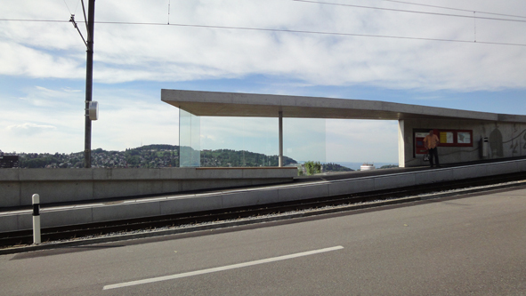 Die neu erstellte Haltestelle der Appenzeller Bahnen erschliesst das Neubaugebiet Birnbäumen und markiert an der Speicherstrasse den Eingang zur Stadt St. Gallen. Die horizontalen Mauerkronen thematisieren die markante Steigung der Strasse und inszenieren die Ausblicke auf die Stadt und den Bodensee.