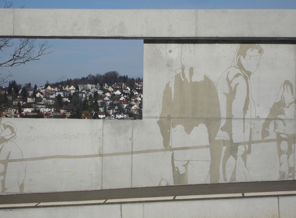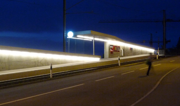 An der Schnittstelle der beiden Mauern entwickeln sich diese zu einem kanzelartigen, gedeckten Wartebereich mit Sitzgelegenheit und integrierter Fahrgast-Infrastruktur. In der Nacht erleuchten zwei Lichtbänder das Bauwerk und das Wandbild, welches den Streckenverlauf der Bahnlinie symbolisiert.