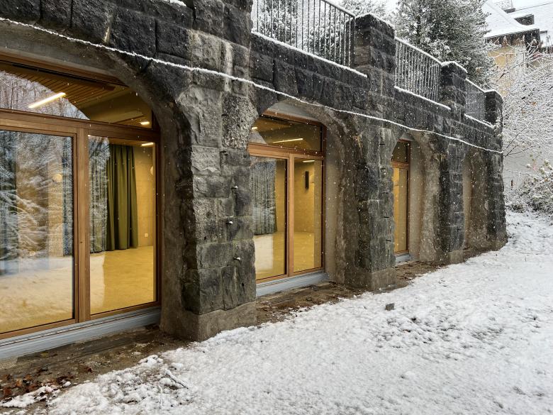 Unter dem Parkplatz, hinter einer bestehenden Geländemauer, wird ein neuer Seminarraum erstellt. Dadurch wird einerseits die einsturzgefährdete Mauer gesichert und die Nutzer erhalten einen multifunktional nutzbaren Raum.