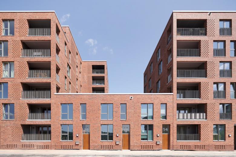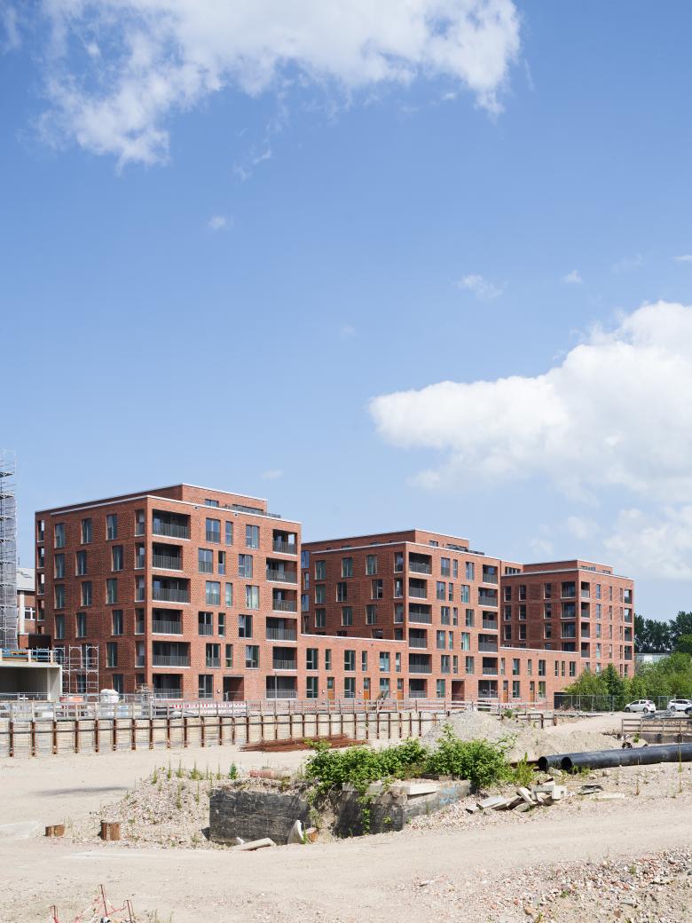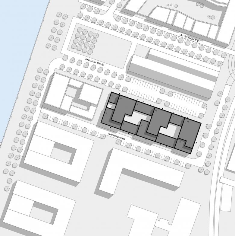 Auf der Grundlage unseres städtebaulichen Masterplans für das Gebiet Kiel Hörn entstand auf dem Baufeld XII im Westen ein Ensemble aus drei siebengeschossigen Wohngebäuden, die mit zweigeschossigen Stadthäusern zu einem städtischen Block zusammengefügt wurden. Im Innern bieten zwei Innenhöfe gute Belichtung für die unteren Geschosse sowie private Gärten für die Stadthäuser. Die turmähnlichen Wohngebäude werden von Norden und Süden erschlossen, was zusammen mit den vielen Eingängen der Stadthäuser für eine Belebung des Straßenraums sorgt. Drei Türme sind als Sechsspänner an einem großzügigen mittigen Treppenhaus konzipiert, von dem aus unterschiedlich große geförderte und frei finanzierte Mietwohnungen zugänglich sind. Alle Wohnungen verfügen über eine Loggia mit Blick auf die Kieler Innenförde. Die Gebäude im Baufeld XII werden einheitlich mit roten Ziegelfassaden errichtet, um die Ensemblewirkung zu stärken.