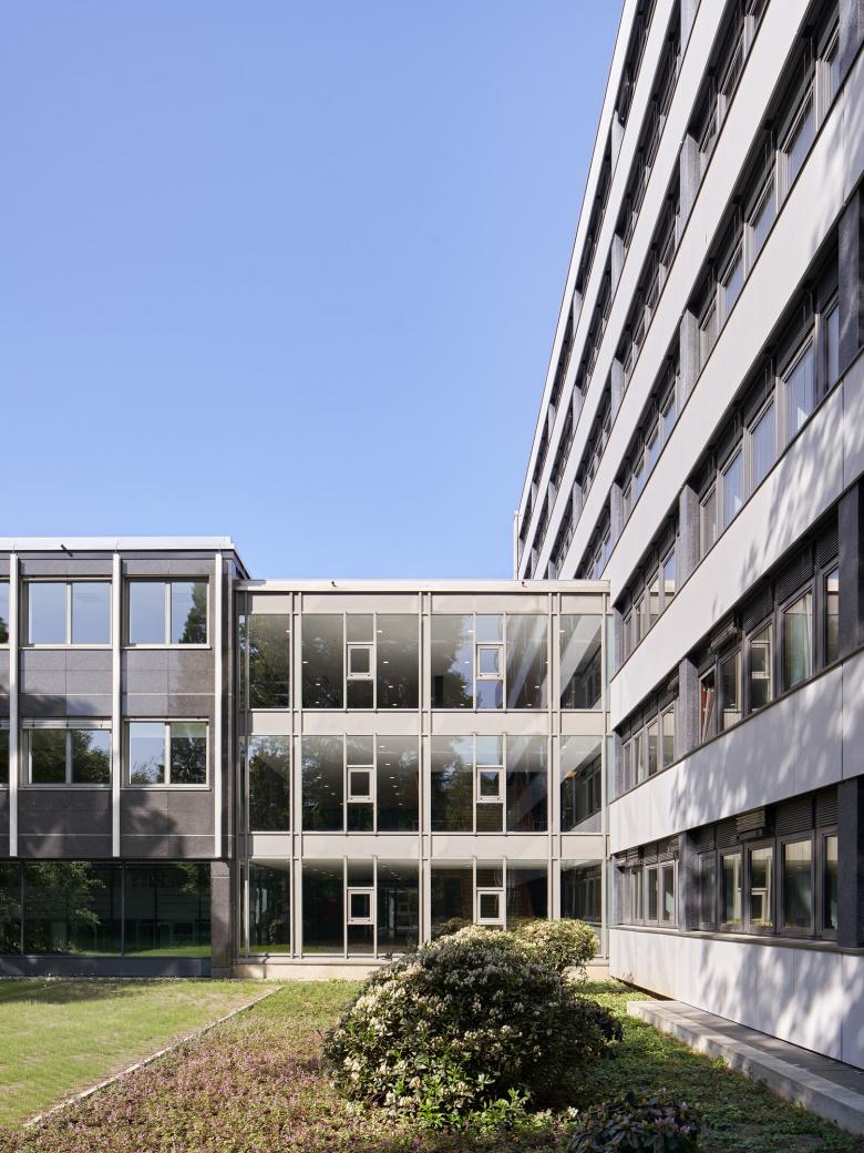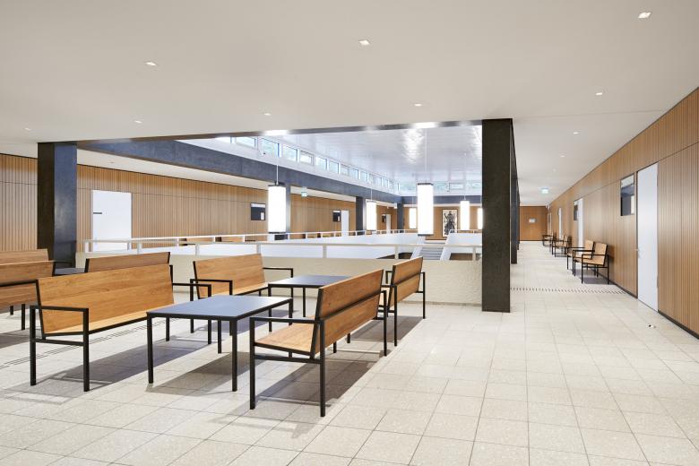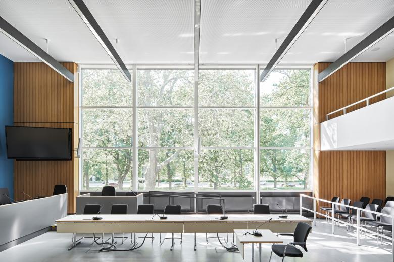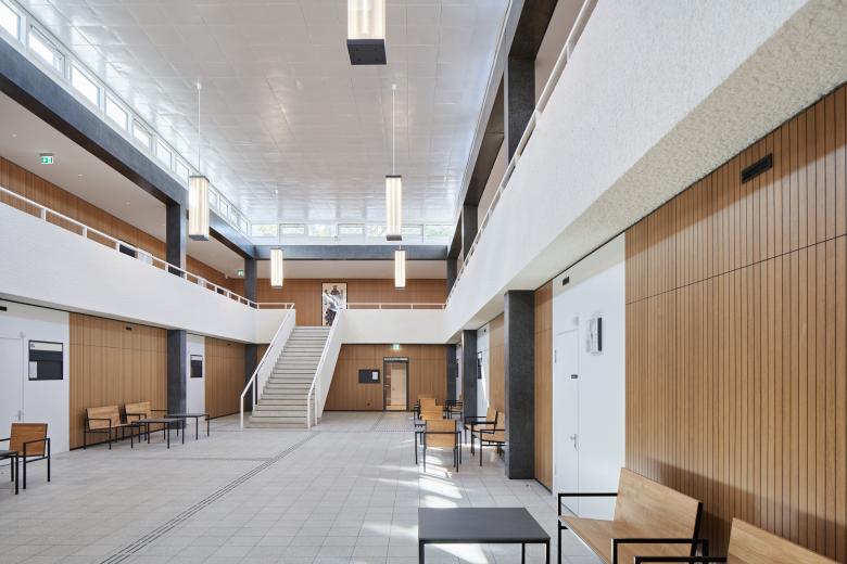 Der winkelförmige Komplex besteht aus einem dreigeschossigen Bau mit insgesamt 17 Gerichtssälen, dem großen Schwurgerichtssaal und einem achtgeschossigen Bürohochhaus mit neun Sälen und fast 200 Büros mit 310 Arbeitsplätzen. Nach einem von uns geplanten und 2009 fertiggestellten Erweiterungsneubau folgte die umfassende Sanierung des Bestandes. Heute ist das Gebäude barrierefrei erschlossen, erfüllt hohe Sicherheitsstandards sowie aktuelle Brandschutzauflagen und besitzt eine moderne Gebäudeausrüstung, beispielsweise zur Integration der digitalen Akte. Wir haben die hohen Anforderungen stets mit denkmalpflegerischen Belangen in Einklang gebracht. Trotz tiefgreifender Maßnahmen konnten wir so den Charakter bewahren: Das Land- und Amtsgericht ist nach wie vor ein Zeuge seiner Zeit, wird aber in seiner Qualität auch zukünftigen Ansprüchen gerecht werden.