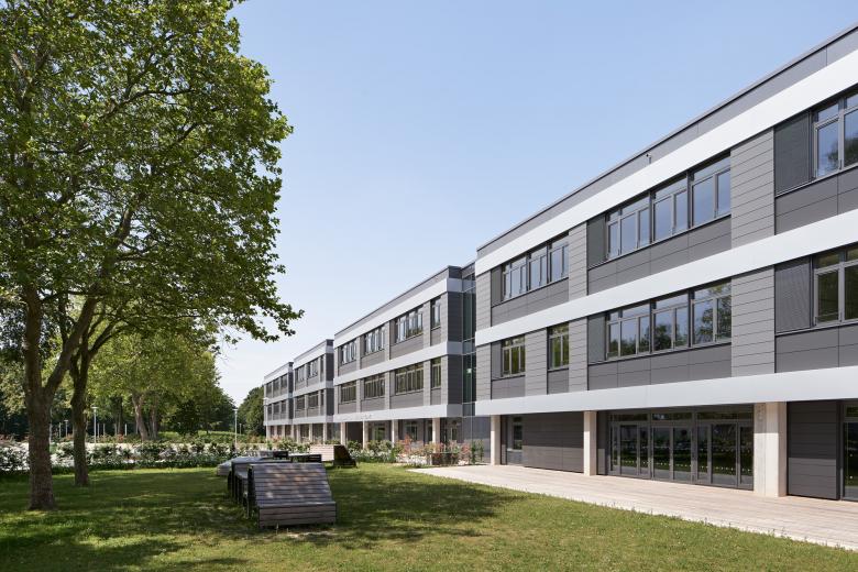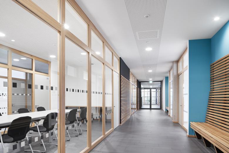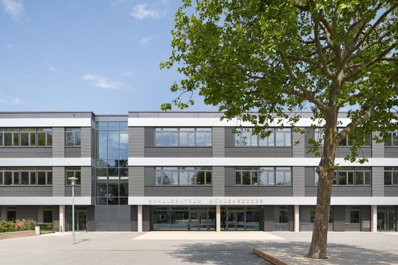 Das Schulzentrum Mühlenredder in Reinbek wurde 1974 nach dem sogenannten Kasseler-Modell als Stahlbetonkonstruktion in Fertigteilbauweise errichtet. Das Gebäude wies in funktionaler, pädagogischer, konstruktiver, energetischer und technischer Sicht erhebliche Mängel auf. Bauzeitlich bedingte Schadstoffbelastungen machten einen völligen Freizug des Hauses für die Baumaßnahme erforderlich. Sämtliche vorgelagerten eingeschossigen Bauteile aus Mauerwerk und Ortbeton wurden abgebrochen, um einen neuen großzügigen Haupteingang zu schaffen, die bis dahin sehr dunkle Schule im Erdgeschoss mit mehr Licht zu versorgen und die Orientierung im Gebäude wesentlich zu verbessern. Im Norden wurde der vorhandene Rohbau genutzt und zu einem Fachklassentrakt mit hellem Innenhof entwickelt. Der dreigeschossige Hauptbaukörper wurde verlängert und durch die Bestandstreppenhäuser in vier maßstäbliche Bauteile gegliedert. In den Obergeschossen wurde eine Dreibundstruktur mit einer großzügigen, mittigen freien Lernlandschaft entwickelt, die über gläserne Differenzierungsräume sehr gut belichtet wird. Das ursprünglich außenliegende Betontragwerk mit Stützen und Unterzügen wurde in die thermische Gebäudehülle einbezogen, indem die neue Fassade als vorgefertigte Holzrahmenkonstruktion davor positioniert wurde. Die Außenfassade wurde durch horizontale Aluminiumbänder und unterschiedlich tiefe HPL-Platten als Transformation der Ursprungsfassade gestaltet. Mit der Sanierung ist es gelungen, unter Ausnutzung der grauen Energie des Rohbaus eine energetisch hocheffiziente Schule nach modernsten pädagogischen Gesichtspunkten zu schaffen.