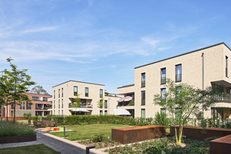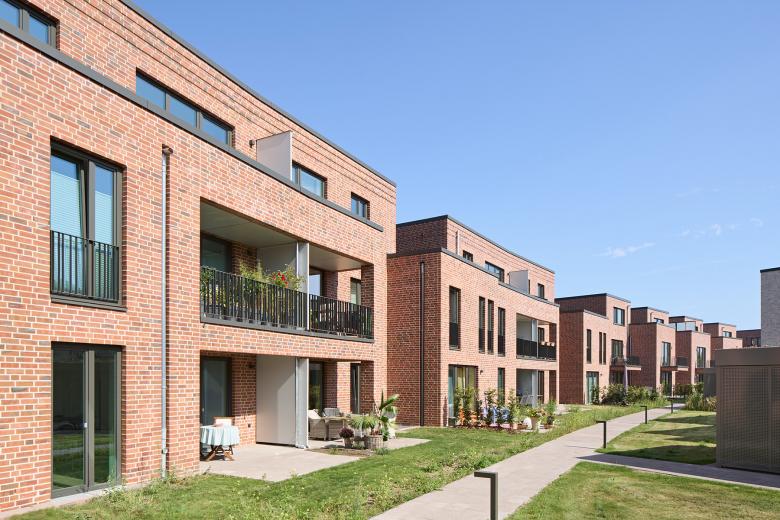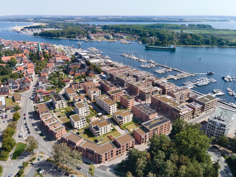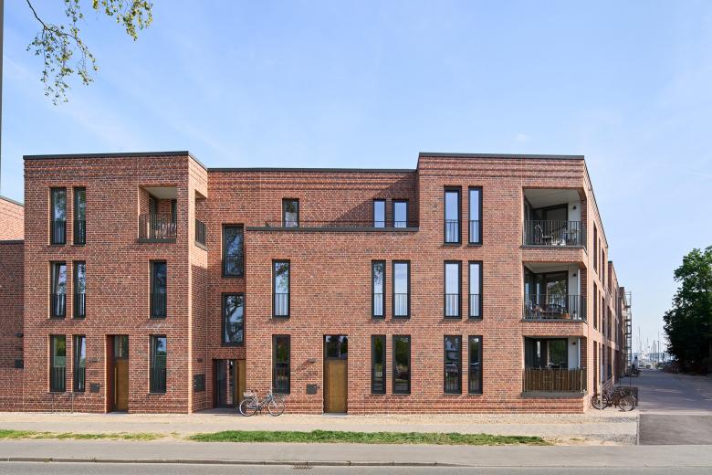 Zu Beginn der Planungen einigten sich alle Beteiligten auf einen Gestaltungsleitfaden, der Aussagen zum Städtebau, zum Freiraum, zu Baukörpern und zur Materialität umfasst. Auf dieser Basis ist ein gestalterisch ruhiges Quartier entstanden, das von der Vielfalt in der Einheit lebt, auch durch die gemeinsame Freiraumplanung. Eine durch uns geplante und mit allen Einzelentwürfen abgestimmte Tiefgarage bietet Abstellmöglichkeiten für 250 PKW und 450 Fahrräder. 25 der 87 von uns entworfenen und bis zur Fertigstellung betreuten Wohnungen wurden öffentlich gefördert. Unsere Wohnungen überzeugen durch großzügige Freisitze und Fensterflächen, optimal nutzbare Grundrisse und eine gradlinige, aber dennoch individuelle Gestaltung bis ins Detail. Gleich, ob in der geschlossenen Randbebauung oder in den freistehenden Häusern im Inneren, das Quartier bietet ein besonderes Wohnumfeld zwischen Wasser und Altstadt.