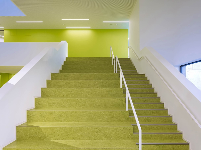 Das von außen durch seine Materialität geprägte Gebäude wird im Inneren zum lebendigen, bunten Spiel- und Lernumfeld für Schüler und Lehrer.