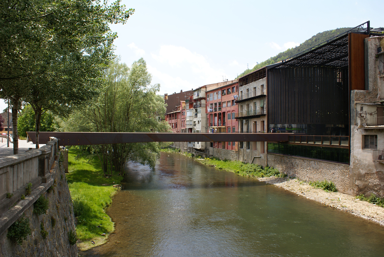 El balcón sobre el Ter, que es el muro que fija el cauce, cierra un espacio cultural polivalente al que se accede desde la plaza por unas escaleras que descienden.