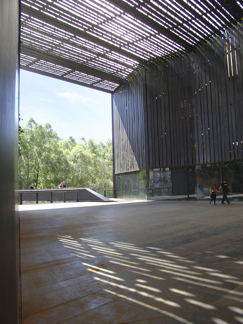Un espacio público surgido del demolido teatro La Lira, desde una calle y frente al río Ter, con sus medianeras al descubierto y los patios de ventilación de los vecinos, quiere ser plaza, punto de encuentro, debates y fiestas, a cubierto. Una cubierta alta, tamiza la luz y desciende por los costados, colonizada por la hiedra. Una pasarela se le ancla, y cruza el río. El balcón sobre el Ter, que es el muro que fija el cauce, cierra un espacio polivalente al que se accede desde la plaza por unas escaleras que descienden. Y el espíritu del teatro permanece.