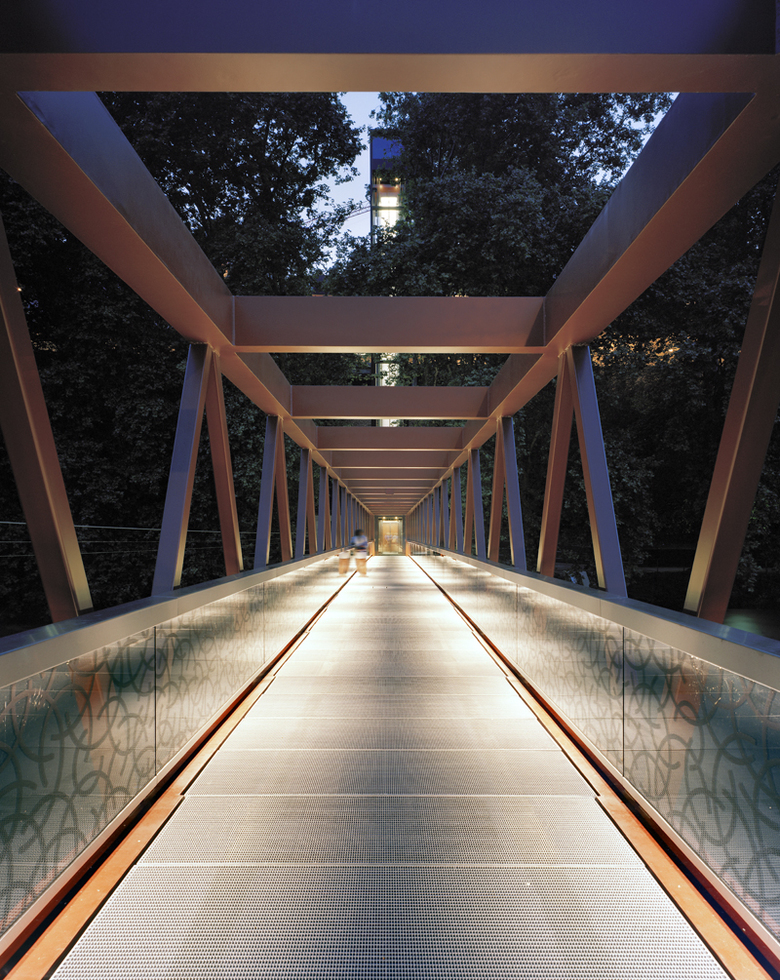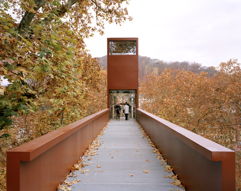 Am Ort der früheren Seilfähre wurde mit einer geradlinigen Wegfigur eine begehbare Skulptur aus Stahl errichtet; gegliedert in einen liegenden Brückenkörper, in einen stehenden Aufzugsturm und in eine liegende Passerelle. Rotbraun – wechselnd temperiert vom Tageslicht – wirkt die Materialität des Stahles naturnah und archaisch. Nachts strahlt sie - inszeniert durch eine indirekte Beleuchtung.