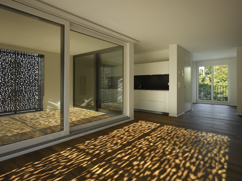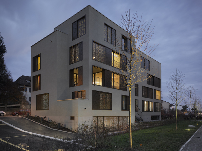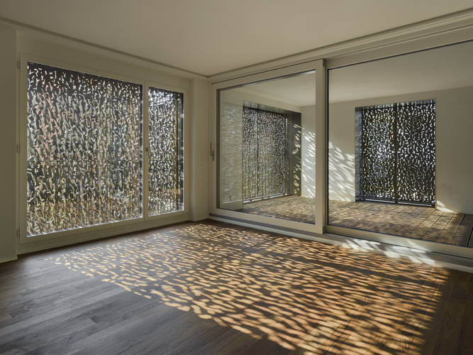 Die mit floraler Geometrie perforierten Schiebeläden leisten einen genügenden Sonnenschutz bei gleichzeitig gewünschter Durchlässigkeit für das Tageslicht und der Kontrolle über die Ein- und Aussichten.