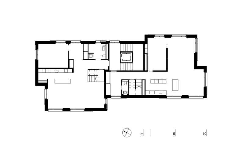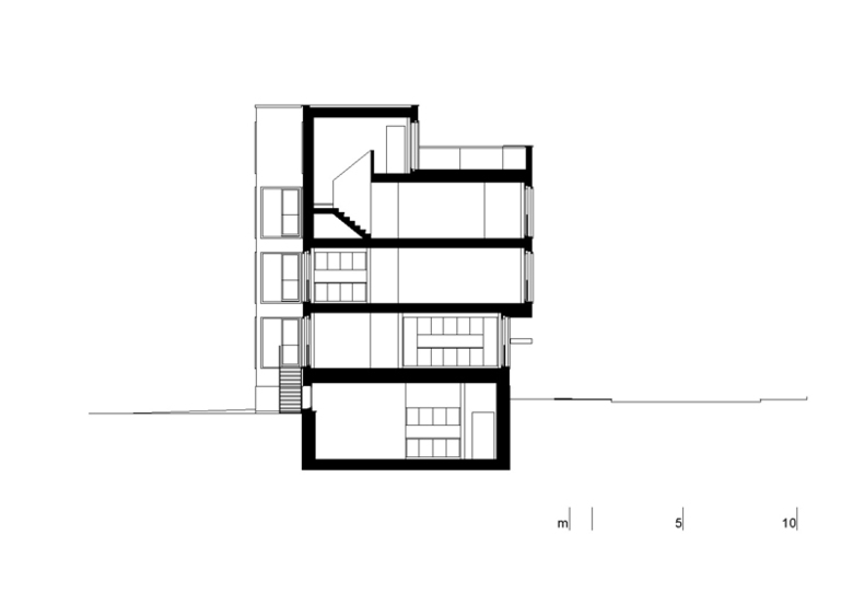 Das Bauvolumen beherbergt in den obersten beiden Geschossen zwei 4 ½ Zimmer Maisonettewohnungen, im Zwischengeschoss zwei 2 ½ Studiowohnungen und im Hochparterre eine 6 ½ Zimmer Familienwohnung mit Gartenabgang. Die Terraingefälle ermöglicht zudem die Integration eines 3 Meter 50 hohen Ateliers im Tiefparterre.