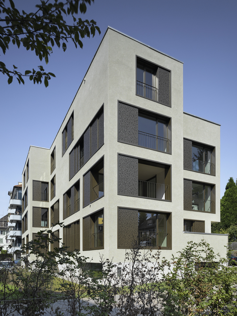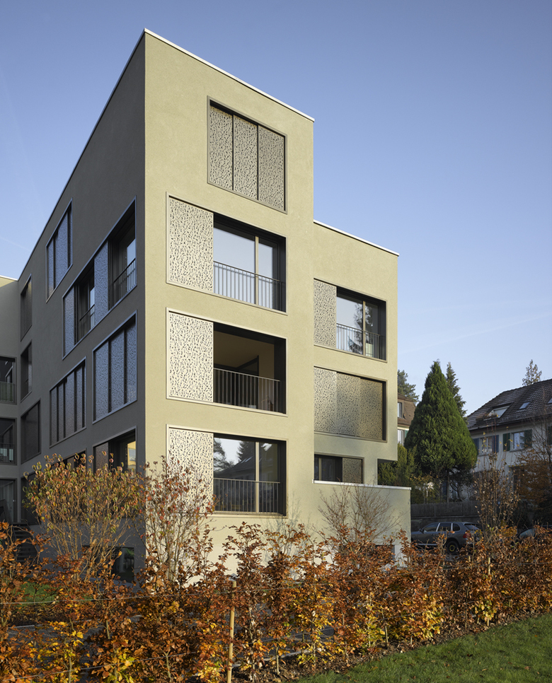 Das Mehrfamilienhaus mit sechs unterschiedlich grossen Wohnungen an der Haldenstrasse 43 in Zürich ist ein Gebäude mit städtischem Charakter. Die leicht kubistische Form des Massivbaus mit weichem offenporigem Kratzputz sowie die grossen Fenster- und Fensterbereiche führen zu einer Erscheinung mit oszillierender Wahrnehmung zwischen Struktur und Masse.
