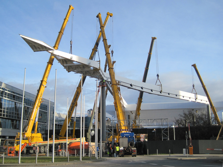 Der Eingang Mitte der NürnbergMesse wurde mit einem 256m langen und 57m breiten Stahl-Lamellendach neu definiert. Es überspannt den Messevorplatz und bildet gleichzeitig das Dach der neuen Eingangshalle. Die Stahlkonstruktion des Daches besteht aus 66 Lamellen, die als voll verkleidete Fachwerkträger ausgeführt sind. Mit einer Höhe von 2.50m spannen sie über eine Länge von 37m. Die Lamellen durchstoßen die beiden hohlkastenförmigen Hauptträger und kragen auf jeder Seiten 10m aus. Die 3m hohen und 80cm breiten Hauptträger sind für Revisionsarbeiten begehbar. Sie lagern auf 12 hochfesten Schleuderbetonstützen auf, die nach oben hin konisch zulaufen. Die 17m hohen Stützen sind mit einem Basisdurchmesser von 1.60m und einer Wandungsstärke von 20cm die größten Schleuderbetonstützen, die bis dahin in Europa ausgeführt wurden. Die Freiräume zwischen den Lamellen sind mit einteiligen ETFE-Folienkissen geschlossen.