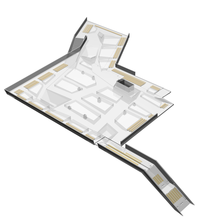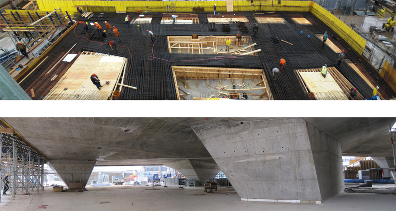 Innerhalb der Eingangshalle entstand der neuer multifunktionaler Konferenzsaal Brüssel. Von der Eingangsebene abgehoben erscheint er fast schwebend und gibt damit den Blick auf den Messepark frei. Der Saalkörper wird durch die stark modellierte und den Kräfteverlauf abzeichnende Untersicht der Tischplatte geprägt. Mit einer Grundfläche von 1500m² bildet die Platte den Boden des Saales und liegt auf fünf skulptural geformten Stützen auf. Dem Kräfteverlauf entsprechend sind in der Platte massive Tragstreifen ausgebildet. Um das Eigengewicht zu reduzieren sind die Bereiche zwischen den Tragstreifen sowie das Innere der Stützen hohl. Die Hohlräume mit einer max. Abmessung von 11m x 6m x 1.25m in der Platte und 9m x 5m x 3m in den Stützen wurden konventionell mit einer verlorenen Schalung erstellt. In den weniger belasteten Randbereichen der Tischplatte wurden PVC-Rohre mit einem Durchmesser von bis zu 50cm verwendet.