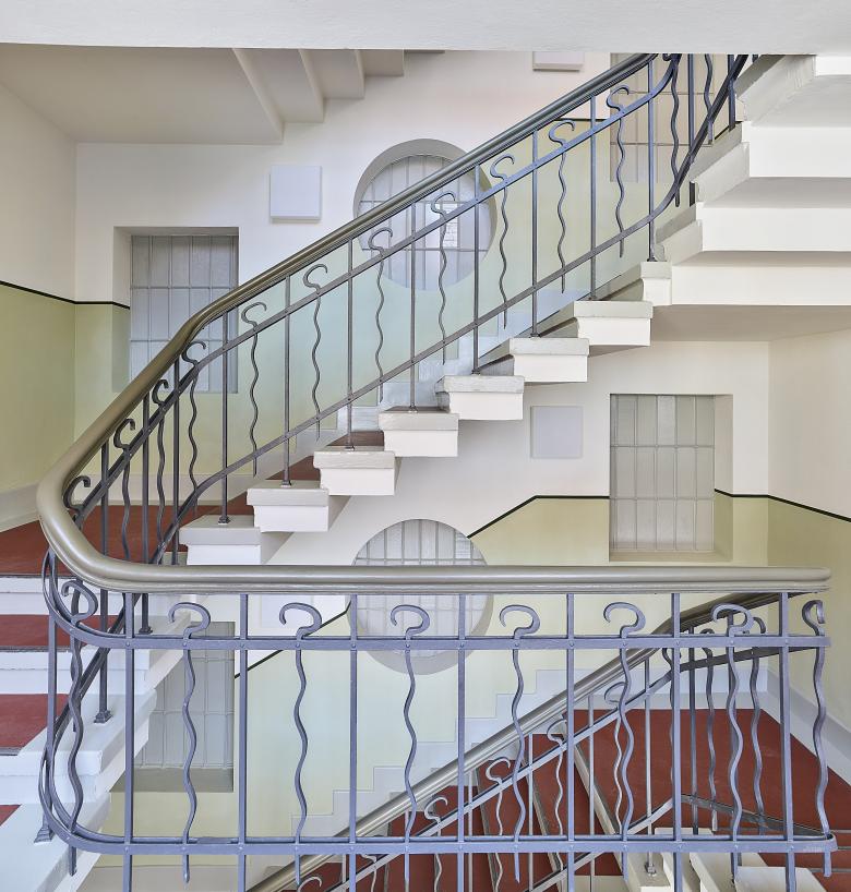 Die teilweise gut erhaltenen Kastenfenstern wurden behutsam restauriert, die Innentüren der Hauptflügel wurden denkmalgerecht aufgearbeitet. Die Türöffnungen in den Nebenbereichen wurden in den letzten Jahrzeiten häufig verändert, sodass keine bauzeitlichen Türen mehr vorhanden waren. Hier kamen Nachbauten zum Einsatz. Eine Besonderheit stellten die Betontürgewände dar. Bei neu herzustellenden Türöffnungen wurden diese nachgebaut.