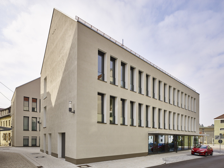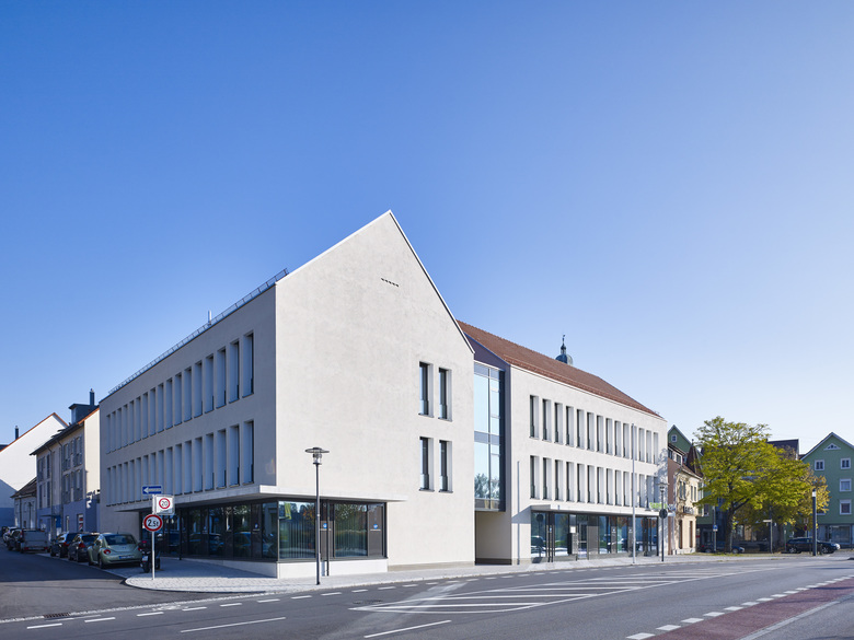 Im Auftrag des Eigenbetriebs „Stadtbau Nürtingen“ ist ein neues Büro- und Geschäftsgebäude mit Seminar- und Prüfungsräumen sowie Dienstleistungen errichtet worden. Das Gebäude fügt sich in die Stadtsilhouette der Mühlstraße ein und reagiert konzeptionell auf die städtebaulich spezifische Körnung des Stadtzentrums von Nürtingen. Es ist winkelförmig gegliedert und nimmt die Fluchten an der Mühl- und Heiligenkreuzstraße auf. Der Baukörper, welcher an der Brandwand der Gebäude Neckarsteige anschließt, definiert den Innenhof des Neubaus hin zur südlichen Bebauung. Die Dachformen übernehmen das Motiv der teilweise giebel- und traufständigen Altbauten an der Mühlstraße und gliedern das Gebäude in seiner Proportion im Stadtgefüge.
