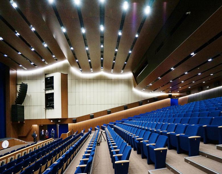 Further requests from the university were that it was the auditorium with the best Moscow acoustics, that the auditorium had a modern and highly recognizable design and that the main finish of the auditorium was in topakustik wood panels.