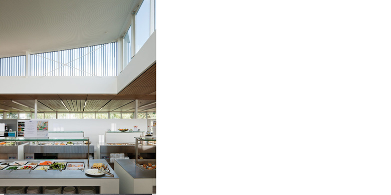 Le long bâtiment principal s’inscrit comme une référence linéaire dans le paysage environnant, sous la forme d’un grand toit abritant des programmes divers: d’un côté la grande halle d’exposition du Showroom, et à l’opposé les bureaux et salles de conférence du Siège. Le hall d’entrée avec son atrium en double hauteur articule et offre une vision sur ces deux parties: la halle d’exposition d’une part, les bureaux et fonctions publiques organisés autour d’une cour-jardin ouverte sur le paysage proche et lointain, d’autre part.