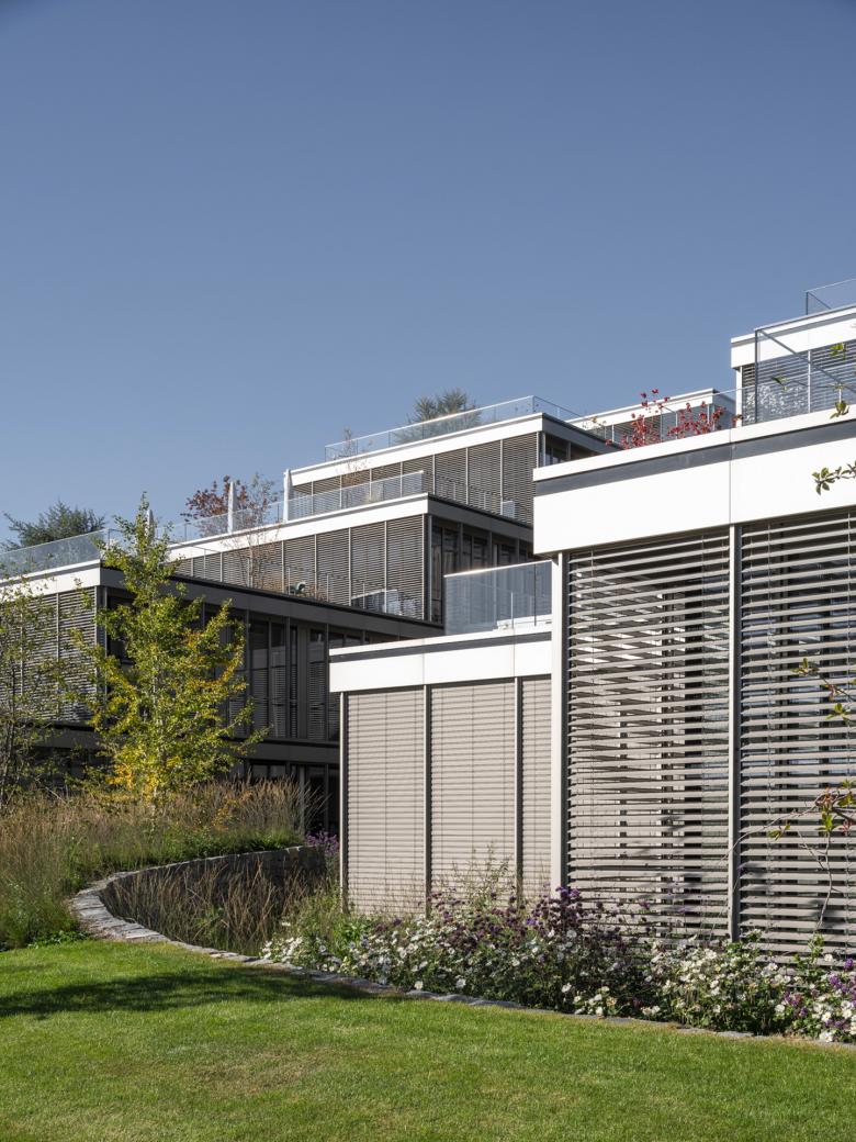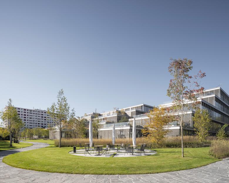 L’enveloppe est constituée de façades rideaux bordées par des coursives protégées par des stores de protection solaire. Ce système, simple et éprouvé, permet d’ouvrir généreusement la vue des espaces de travail sur les espaces végétalisés entre les bâtiments, ainsi que sur le paysage plus lointain.