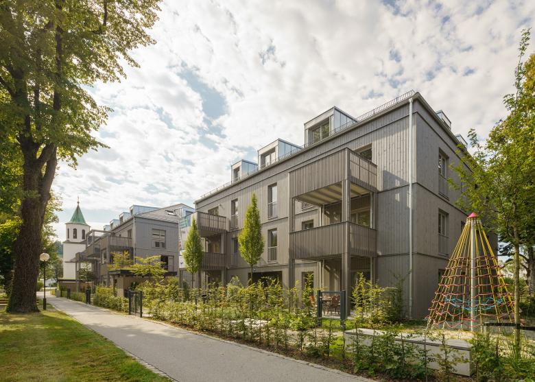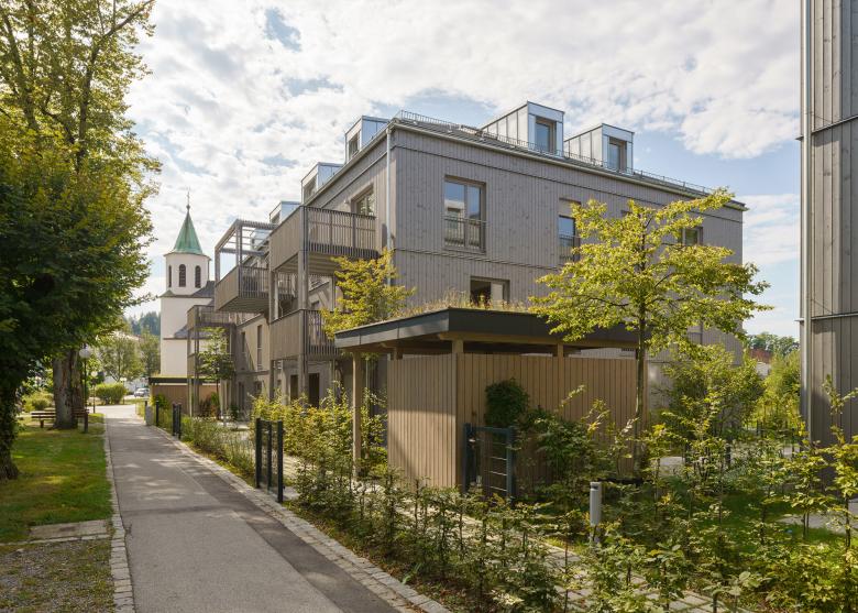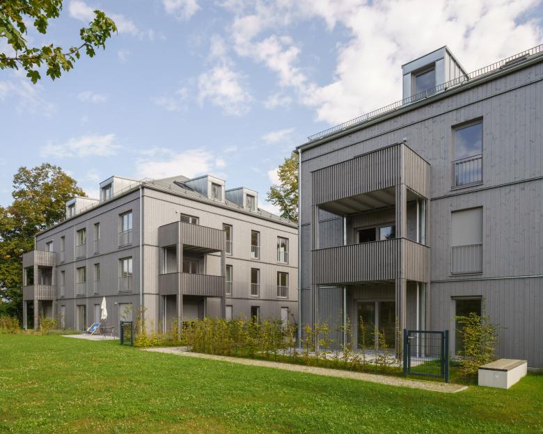 Eine besondere Aufgabe des Entwurfes war das Zusammenbringen der hieraus resultierenden Anforderungen an Wohnungsmix und -größen sowie den Vorgaben der Stellplatzsatzung mit einer für für den Holzbau sinnvollen Gebäudestruktur die eine wirtschaftliche Ausführung mit hohem Vorfertigungsgrad und bestenfalls typengleichen Bauteilen ermöglicht. Die beiden Gebäude sind in Holzbauweise nach Förderkriterien des KfW55-Standards konzipiert. Alle Wohnungen erhalten großzügige Freibereiche in Form von vorgestellten Balkonen sowie Terrassen im Erdgeschoss. Die Fassade erhält eine geschossweise getrennte vertikale Holzverkleidung aus einer grau beschichteten Fichtenschalung. Die Fensterelemente sind raumhoch aus farblich an die Fassade angepassten Holz-Aluminiumprofilen.