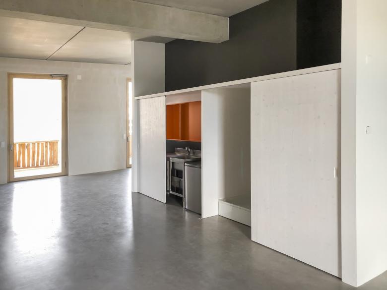 Das Atelier 2.02 in der Erlenmatt wurde für zwei Künstlerinnen nach ihren spezifischen Bedürfnissen in zwei Einheiten für Hallen-Wohnen und Arbeitsatelier konzipiert. Der Innenausbau wurde nach strengen ökonomischen Prinzipien umgesetzt.