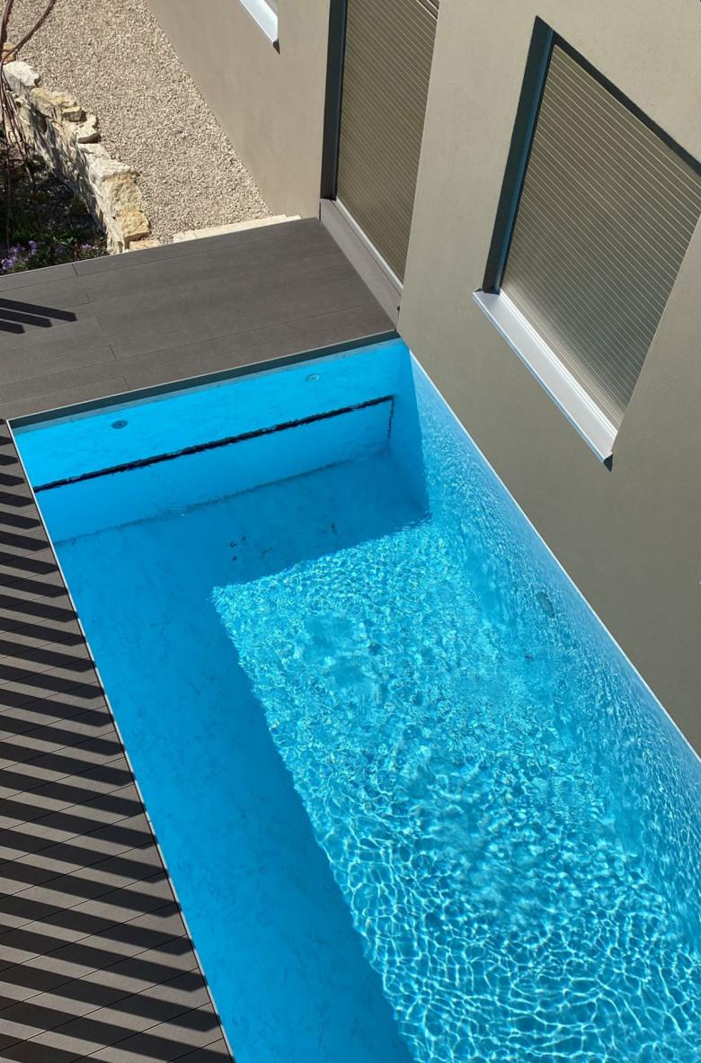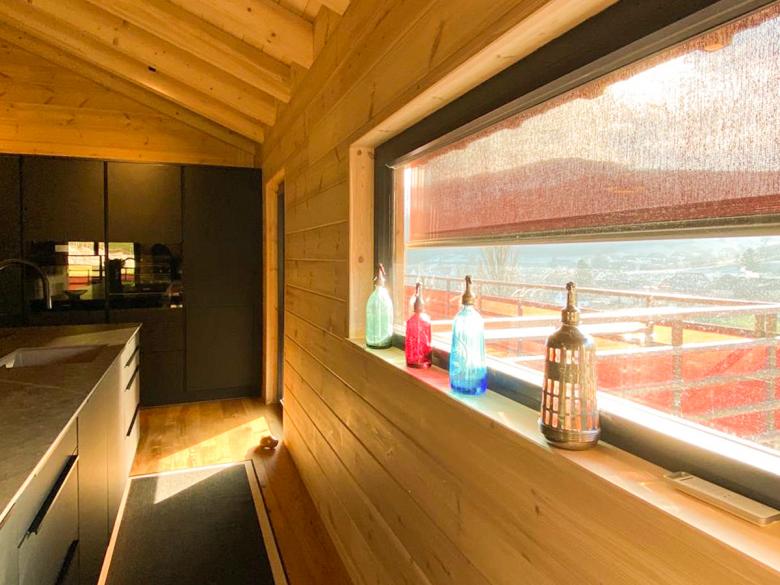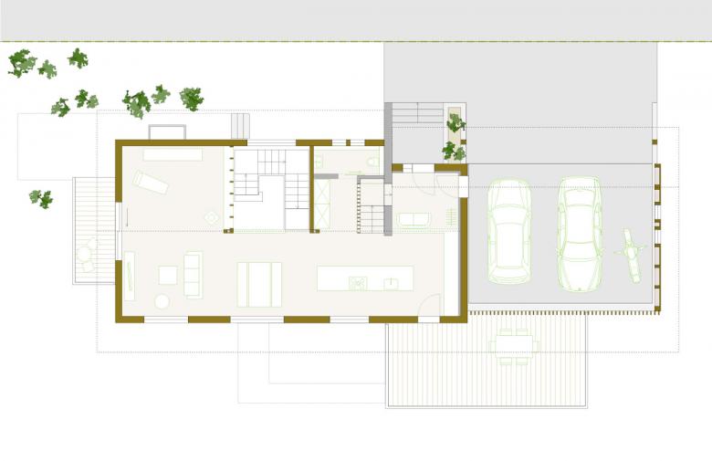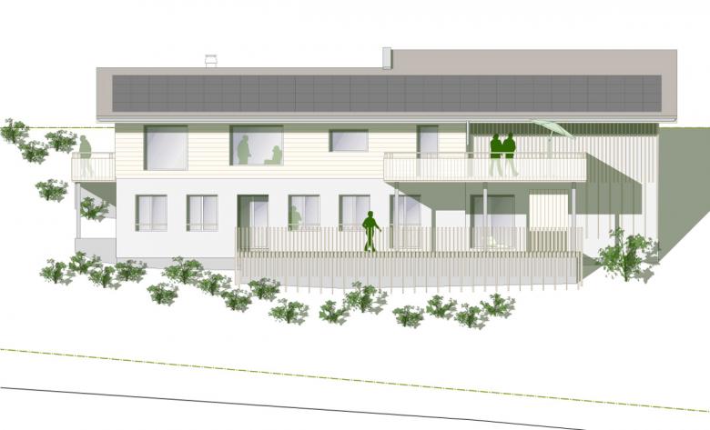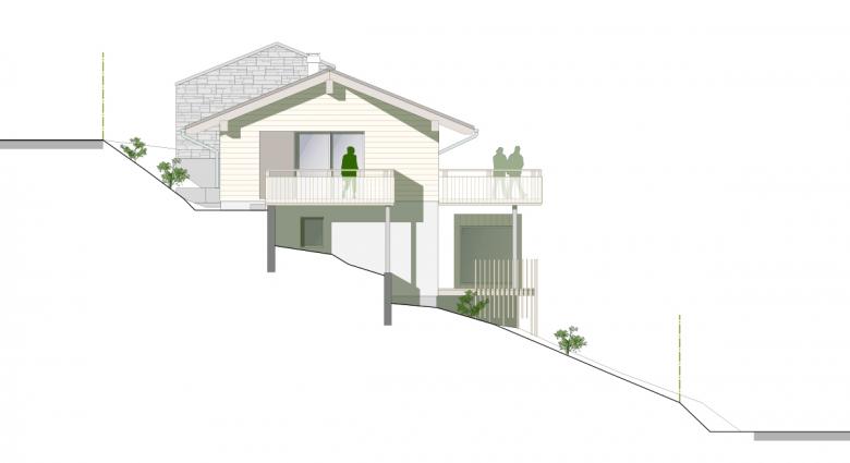 Aufgesattelt auf einem Sockel in Massivbau liegt ein langgezogener Holzbau, gegliedert in einen offenen Wohnteil und einen Remisenteil (Garage). Das Gebäude ist im Hang gestaffelt - es ergeben sich Abstufungen, welche unter Anderem als Swimmingpool genutzt werden.