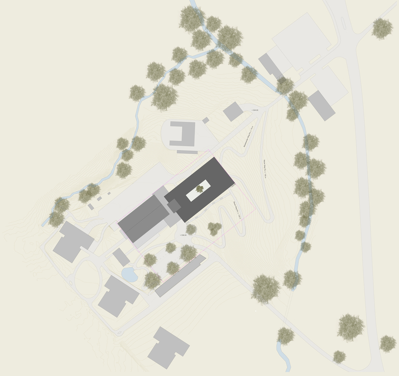 Der neue Baukörper ist das Hauptelement der Anlage und fügt sich als muraler Kubus in die Topographie der offenen Landschaft über dem Sempachersee ein.