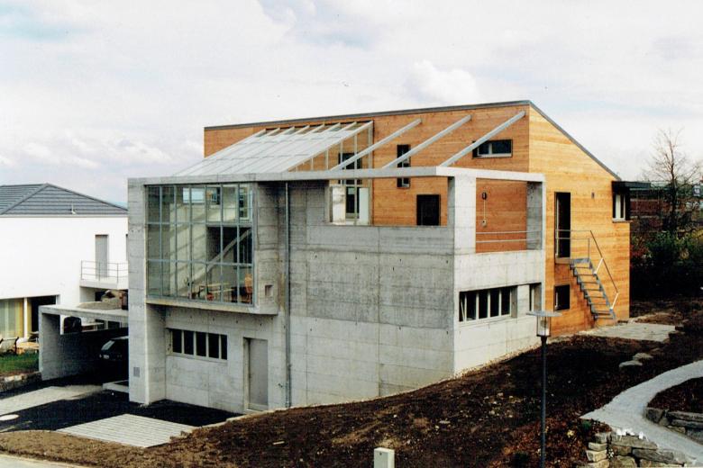 Das Einfamilienhaus, aus einem vorgegebenen Gestaltungsplan entwickelt, in schöner Hanglage am Siedlungsrand des Dorfes mit Sicht auf den Sempachersee, ist ausgeprägt gegliedert um eine entsprechende Nutzung zu erzielen. Das Gebäude besteht aus zwei Baukörpern - einem harten, nicht gedämmten, plastischen Betonkubus und einem leichten, abgesetzten Holz-Trakt. Die Schnittstelle der beiden Konstruktionsteile bildet eine Kaskadentreppe, welche die im Split-Level angeordneten Ebenen erschliesst.