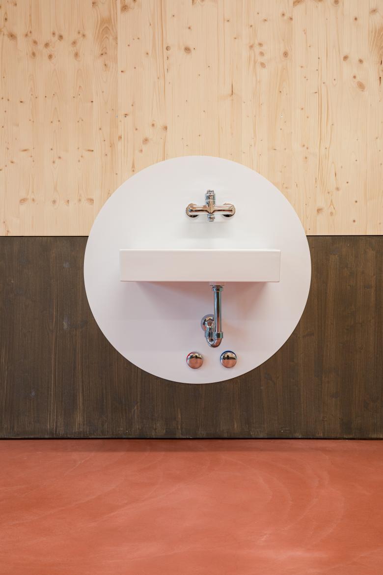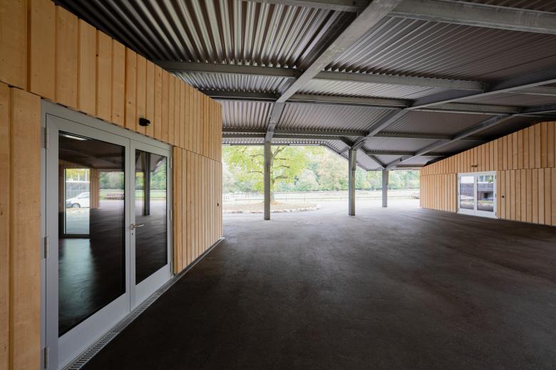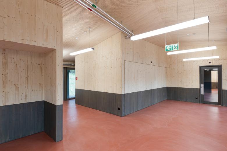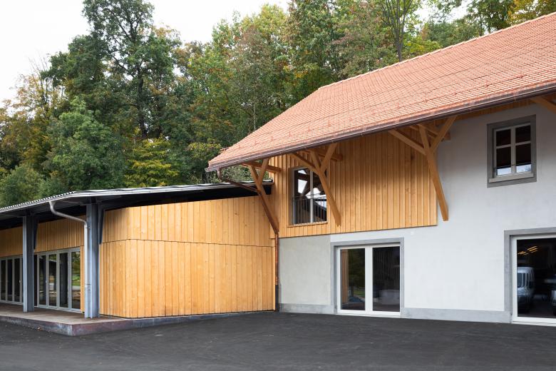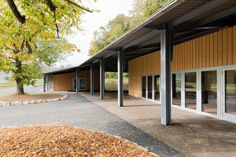 Das Zentrum Erlenhof ist eine Institution für Neuorientierung, Entwicklung und Ausbildung von Jugendlichen und jungen Erwachsenen. Der Erweiterungsbau ist ein integrierter Bestandteil der Häusergruppe im Bereich Werkstatt und ergänzt das Ensemble als weiterer Baustein. Das Gebäude füllt in seiner Setzung und Volumetrie die zur Verfügung stehende, sehr beengte bebaubare Fläche aus. Das eine gemeinsame Dach schwingt sich großzügig über den gesamten Bereich und nutzt die ungleichmässige Begrenzung durch die Waldlinie und den Strassenabstand voll aus. Das Dach als starkes Erkennungsmerkmal schafft eine deutliche Identifikation des Arbeits- und Ausbildungsplatzes. Die unter dem Dach angeordneten Baukörper für die Werkstatträume halten durch ihre Setzung einen grossen gedeckten Aussenbereich frei. Das Tragwerk mit dem Dach als unabhängige Stahlkonstruktion und die kompakte eingeschossige Bauweise der Werkstätten in Holzbau ermöglicht eine freie und von der Tragstruktur unabhängige Raumeinteilung innerhalb der Werkstätten. Die Betriebe sind flexibel nutz- und unterteilbar. Somit konnte während der Bauzeit und kann auch in Zukunft auf vielfältige und wechselnde Nutzeranforderungen eingegangen werden.