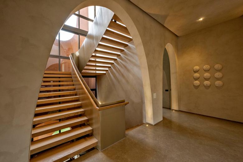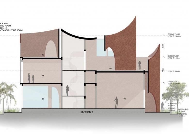 This sculptural house is contextual to its surroundings, the climate, and the owner's needs, resulting in an interesting play of volumes, open, enclosed, and semi-enclosed spaces at every level. The design creates energy-efficient spaces with reduced heat gain and indirect natural light in each part of the house.