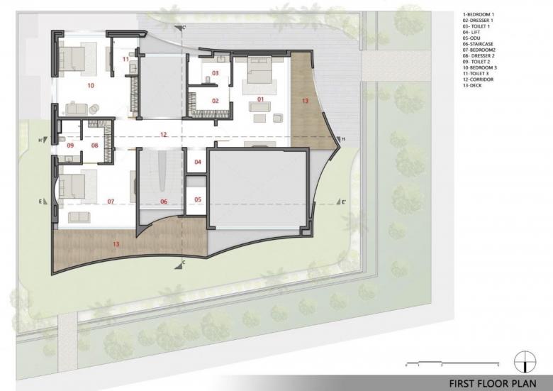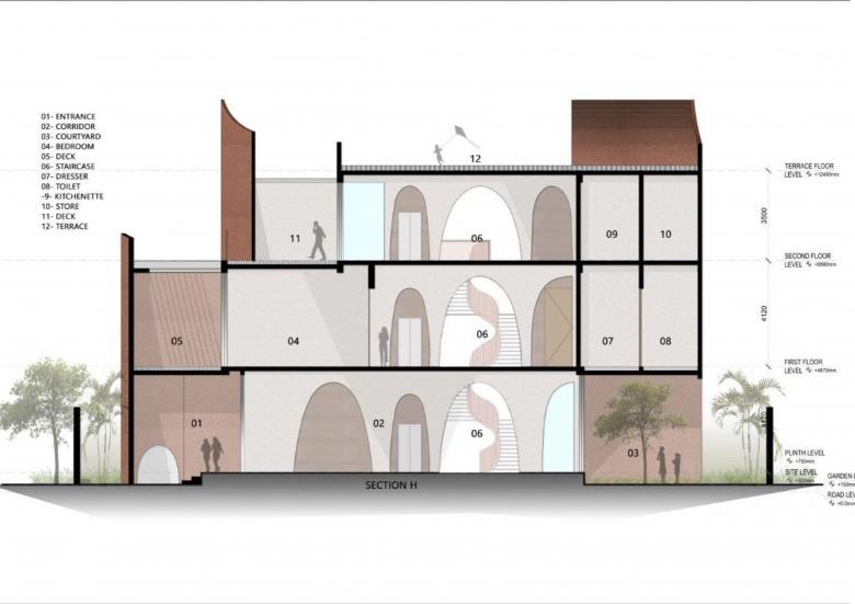 Sectionally, the heights within it are varied with an interesting play of volumes in each part of the house, including bedrooms of a single volume, a dining area of a double volume, and a living area of an intermediate 1.5 level volume.