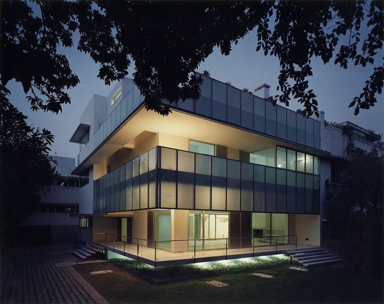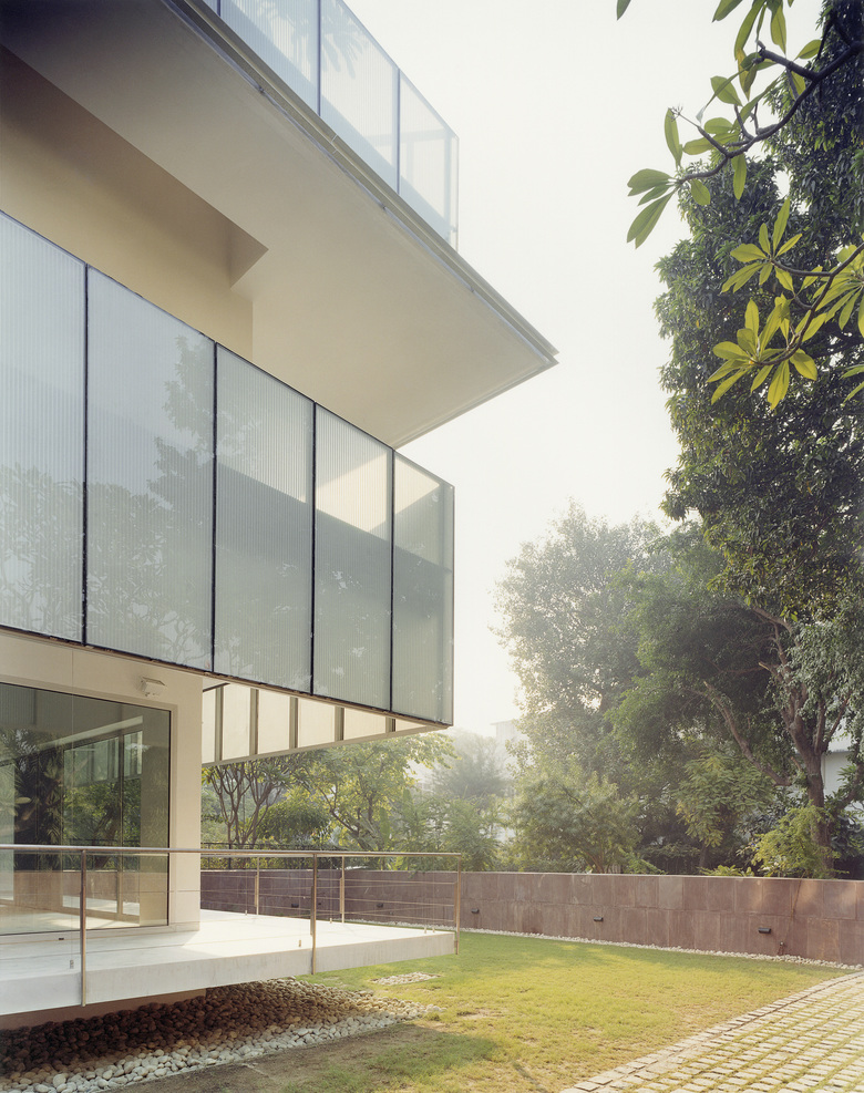 A new type of structural glazing integrating a perforated aluminum sheet was especially developed in order to provide transparency and heat rejection at the same time, keeping the soft light of a traditional jali wall with a low maintenance material, ever changing with the sun course. The house becomes a light box at night when the illumination comes from the inside.