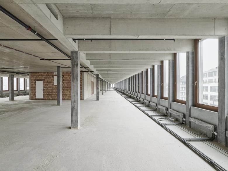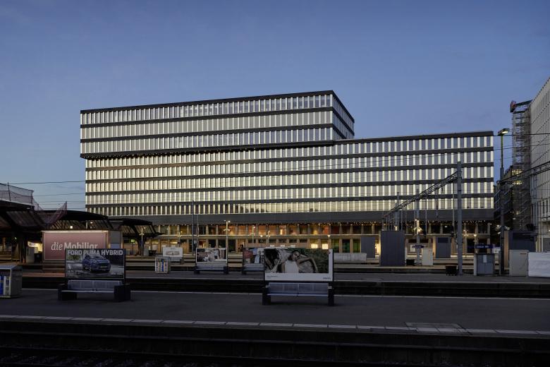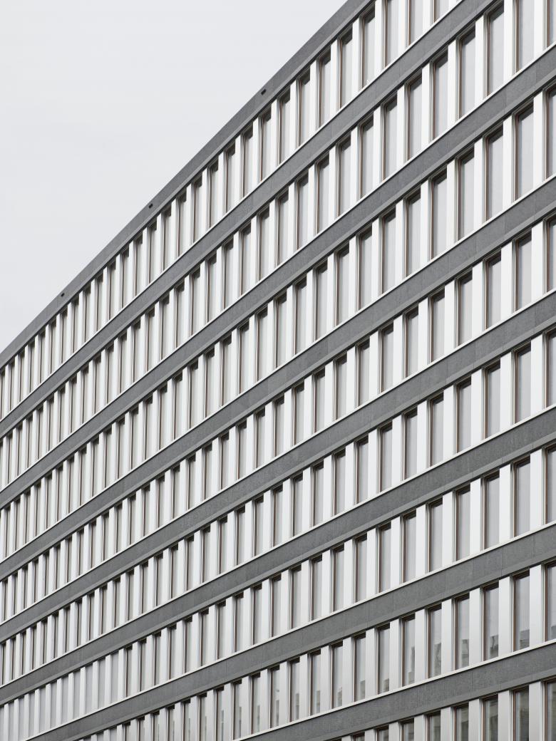 Das Büro- und Geschäftsgebäude liegt an zentralster Lage beim Zürcher Hauptbahnhof und bildet gemeinsam mit der Pädagogischen Hochschule den Auftakt zum neuen Stadtteil Europaallee. Auf einer schmalen trapezförmigen Parzelle zwischen Gleisfeld und Europaplatz errichtet, besteht es aus einem zweigeschossigen Sockel und einem siebengeschossigen Riegel. Auf seiner Schmalseite am Europaplatz wächst das Gebäude zu einem zehngeschossigen Kopfbau an und gilt damit als Hochhaus. Sein Erscheinungsbild leitet sich weitgehend aus der Gebäudestruktur ab. Die Fassade ist durchgehend repetitiv aufgebaut, mit einem Rasterwechsel am Übergang zu den verglasten Sockelgeschossen, wo enorme Träger die Lasten der Obergeschosse abfangen. Die einzigen rein formalen Elemente sind gegenseitige Verschiebungen der drei Gebäudeteile, mit denen der Bau auf seine Umgebung reagiert. Zum Europaplatz hin wird damit der öffentliche Charakter der Laden- und Gastroflächen im Erdgeschoss akzentuiert, zum Gleisfeld das Bild eines Stellwerks aufgegriffen. Die Fassade wird in schwarzem Schwedischen Granit ausgeführt, die Zargen der Holzfenster aus Chromstahl und der Sonnenschutz der Obergeschosse aus glänzenden Mikrolamellen in Edelstahl.