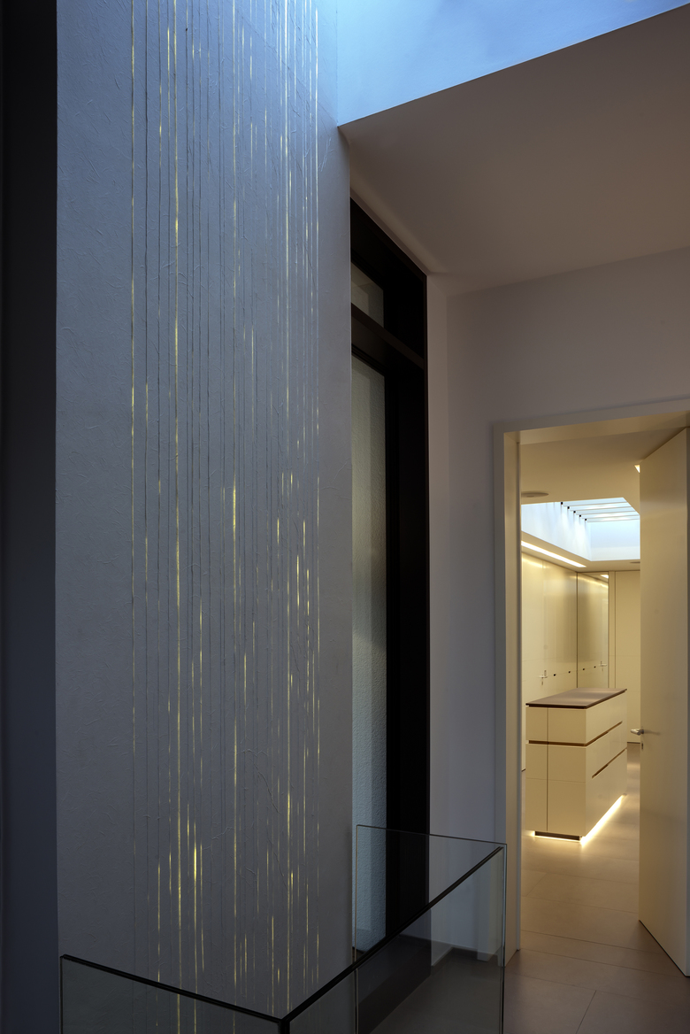 Ausschließlich indirektes, brillantes Licht, platziert an ausgewählten Bereichen und Elementen der Architektur (Stützen, Zu- und Ausgängen, Abschlußwänden oder Kreuzungspunkten), erzeugt jeweils punktuell eine visuelle Raumerhöhung.