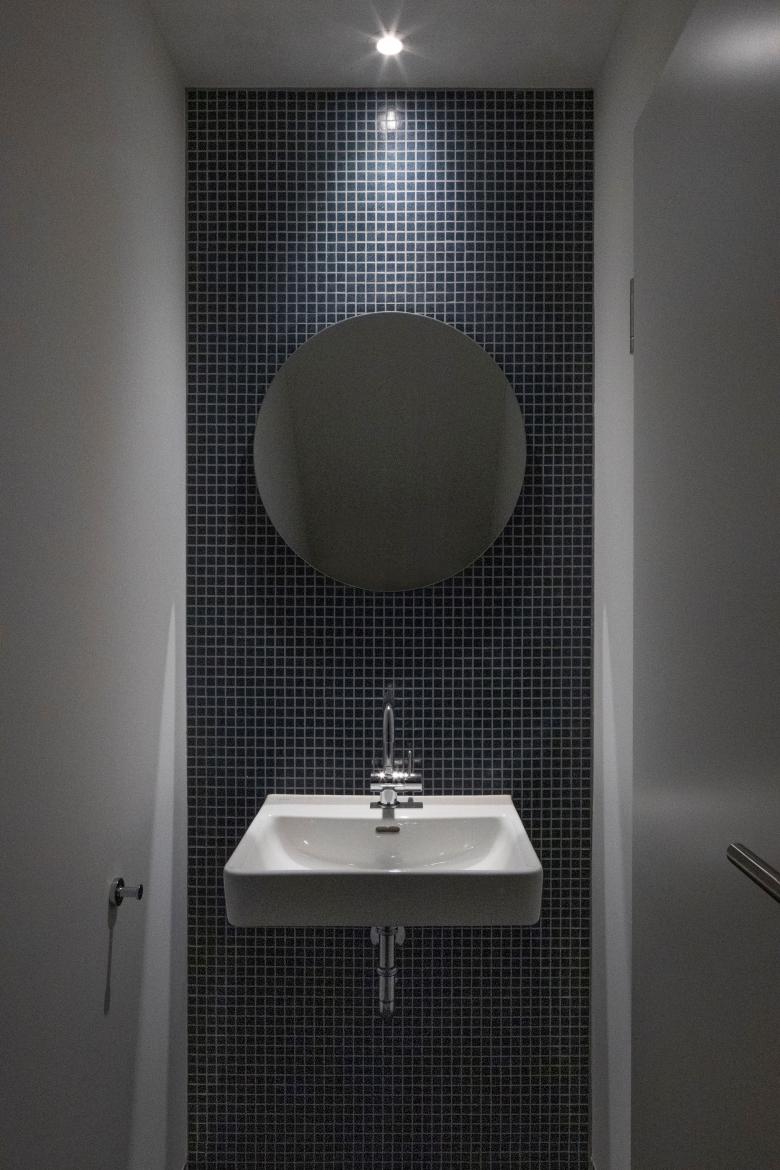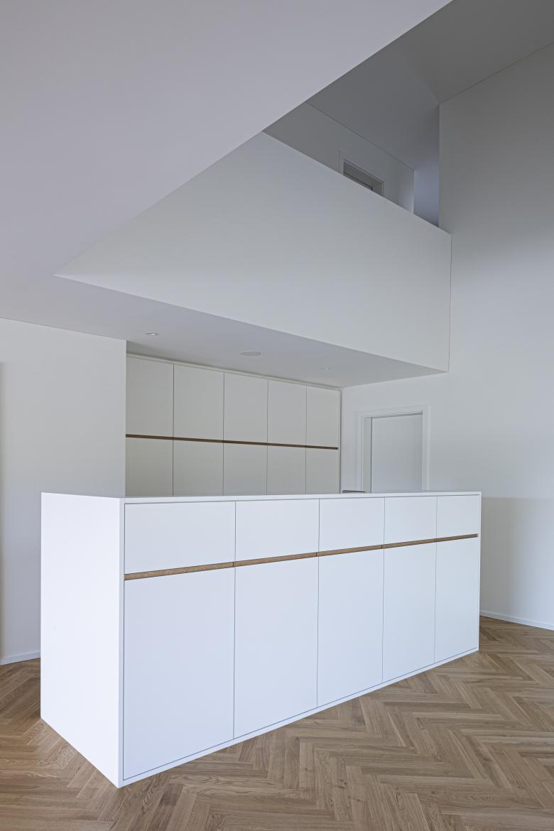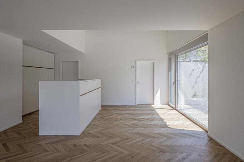 Die Materialisierung im Innern mit verputzen Wänden und Decken in Weissputz, hochwertigem Fischgratparkett und farbigen Glasmosaik-Belägen in den Nassräumen ist zurückhaltend und zeitlos.