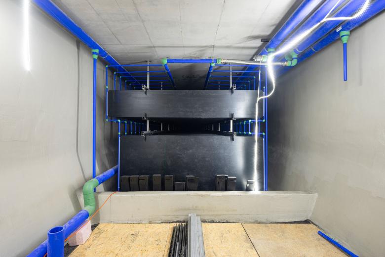 Die unteren beiden Geschosse des Verbindungsbaus fungieren als ein offener, stützenfreier Durchgang. Die Decke des Durchgangs ist mit verspiegelten Edelstahlblechen in Onyx Black versehen, die fließende Reflektionen entstehen lassen – eine Hommage an den Standort des Ensembles direkt am Wasser.