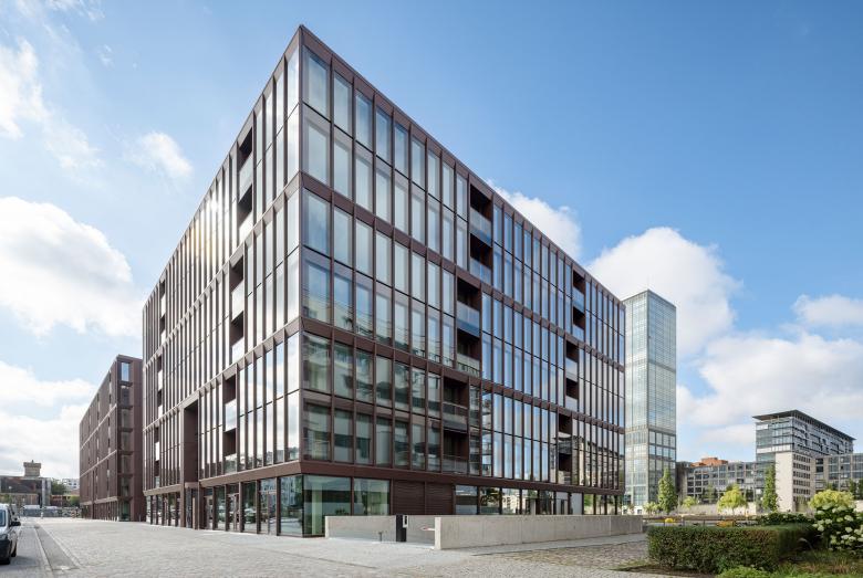 Im Berliner Osthafen entstand mit Dockyard ein moderner siebengeschossiger Bürogebäudekomplex mit Tiefgarage in nachhaltiger, klima- und ressourcenschonender Holz-Hybrid-Bauweise. Das Bauvorhaben Dockyard umfasst einen quadratischen und einen rechteckigen Baukörper, zwischen denen ein gläserner Verbindungsbau mit sichtbarer Holz-Fachwerkkonstruktion aus nachhaltiger Baubuche vermittelt.