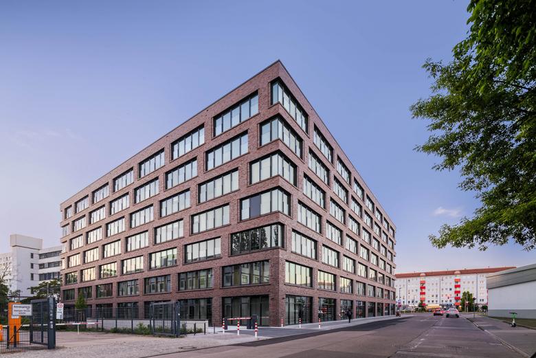 Auf dem rund 6.000 m2 großen Eckgrundstück zwischen Frankfurter Allee und Buchberger Straße im Berliner Bezirk Lichtenberg entstand ein modernes, trapezförmiges Bürogebäude mit begrüntem Innenhof und einer expressiven rostroten Klinkerfassade, die sich in Materialität und Farbigkeit an den historischen, Anfang des 20. Jahrhunderts entstandenen industriellen Bestandsgebäuden orientiert und einen neuen kontrastreichen Akzent zur sonst postmodernen Umgebungsarchitektur aus der DDR-Zeit setzt.