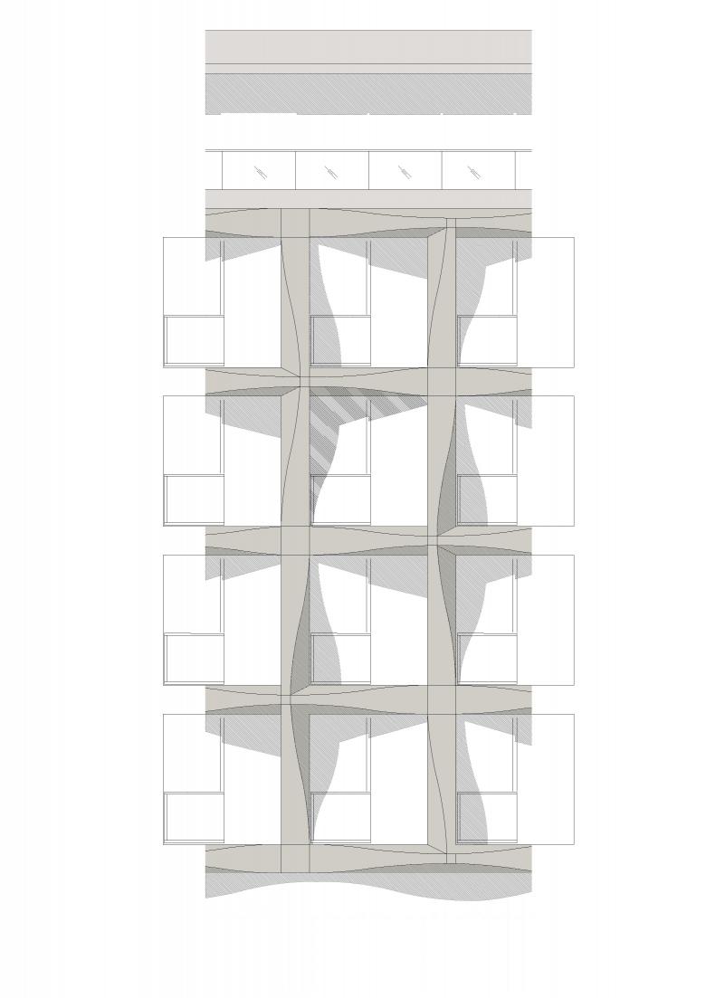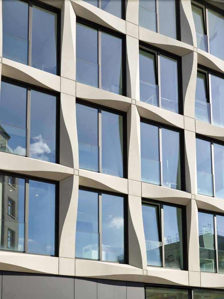 Die Straßenfassade im Erdgeschoß besteht aus großformatigen Isolierverglasungen in Pfosten-Riegel-Konstruktion. Vom ersten bis zum vierten Obergeschoß baut sich die Fassade in einem quadratischen Raster aus Architekturbeton auf. Die in sich leicht gedrehten Pfeiler und Geschossdeckenbänder treffen sich abwechselnd entweder auf einem Hoch-, oder einem Tiefpunkt und formen auf diese Art ein zusammenhängendes, dynamisches, organisch-fließendes Gewebe. An den Hochpunkten der Gitterstruktur tritt die Fassade 50 cm über die Baufluchtlinie hervor. Die Innenhof-Fassaden wurden als Putzfassaden mit umlaufenden Fensterbändern mit Metallgeländer umgesetzt. Der Dachbereich mit seiner zurückhaltend gestalteten Glasfassade bildet den klaren, ruhigen Gebäudeabschluss.