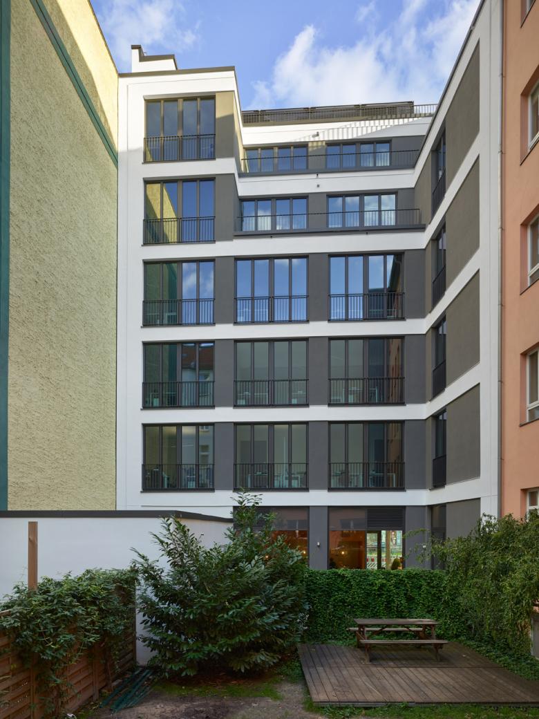 Der als modernes Büro-Business-Center genutzte Neubau folgt straßenseitig der Bauflucht und schließt unter Einhaltung der Abstandsflächen im Hof und unter Ausnutzung der maximalen Bebauungstiefe an die Brandwände der Nachbargebäude an. Um die Abstandsflächen einzuhalten, besitzen das 4. und das 5. Obergeschoss hofseitig ebenfalls Rückstaffelungen. Alle Neubauteile schließen mit Flachdächern ab.