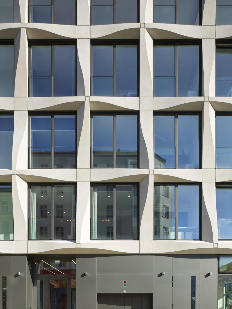 Auf dem rund 464 m² großen Eckgrundstück zwischen Greifswalder Straße und Heinrich-Roller-Straße im Berliner Bezirk Pankow, Ortsteil Prenzlauer Berg, entstand ein Büroneubau, dessen expressiv-lebhafte Hauptfassade mit ihrer geschosshohen, quadratischen Gitterstruktur aus hellen Architekturbeton-Fertigteilen sofort ins Auge fällt.