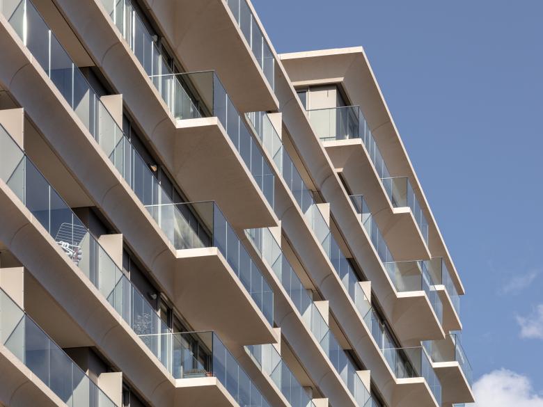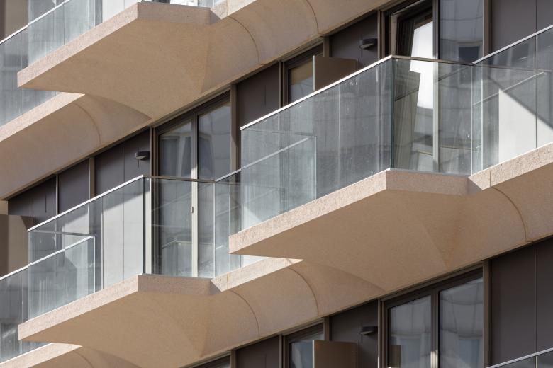 Ungeachtet seiner großen Dimensionen präsentiert sich das Gebäude leicht und offen durch die raumhohen, großzügigen Fensterfronten und einem offen gestalteten, flächig verglasten Erdgeschoss. Die aus gefärbtem Architekturbeton aufwendig gestalteten, voutenartigen Gesimsbänder bilden eine fließende Linie mit den Balkonen, Loggien und bodentiefen Fenstern und verleihen der Fassadenmatrix zusätzlich Plastizität und Spannung. Unterstützt wird die horizontale Betonung durch die schmalen durchgehenden Brüstungen, die dem Volumen gemeinsam mit dem Rhythmus transparenter und opaker Glaselemente einen unverwechselbaren Charakter verleihen.